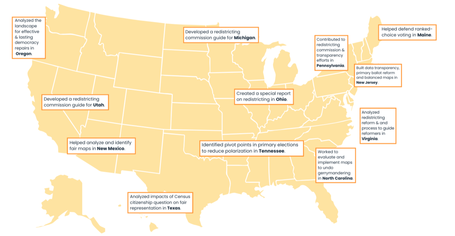 Non-partisan, independent, and evidence-driven, we envision an American democracy in which voters gain and maintain the power to choose their government to achieve fair and meaningful representation for all.